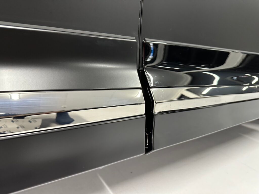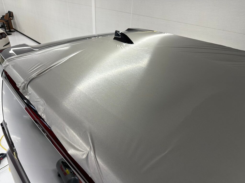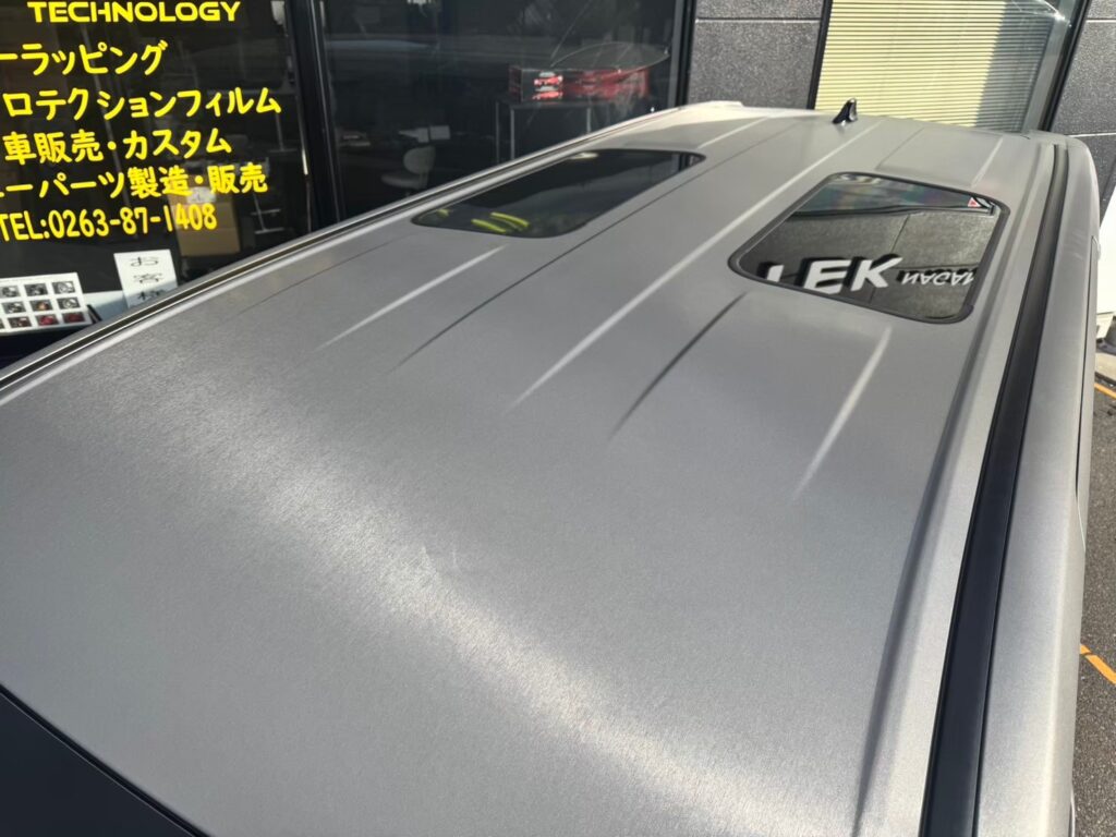 最後に、ボディの上半分をシルバーのヘアライン柄のラッピングフィルムで施工させて頂きました!