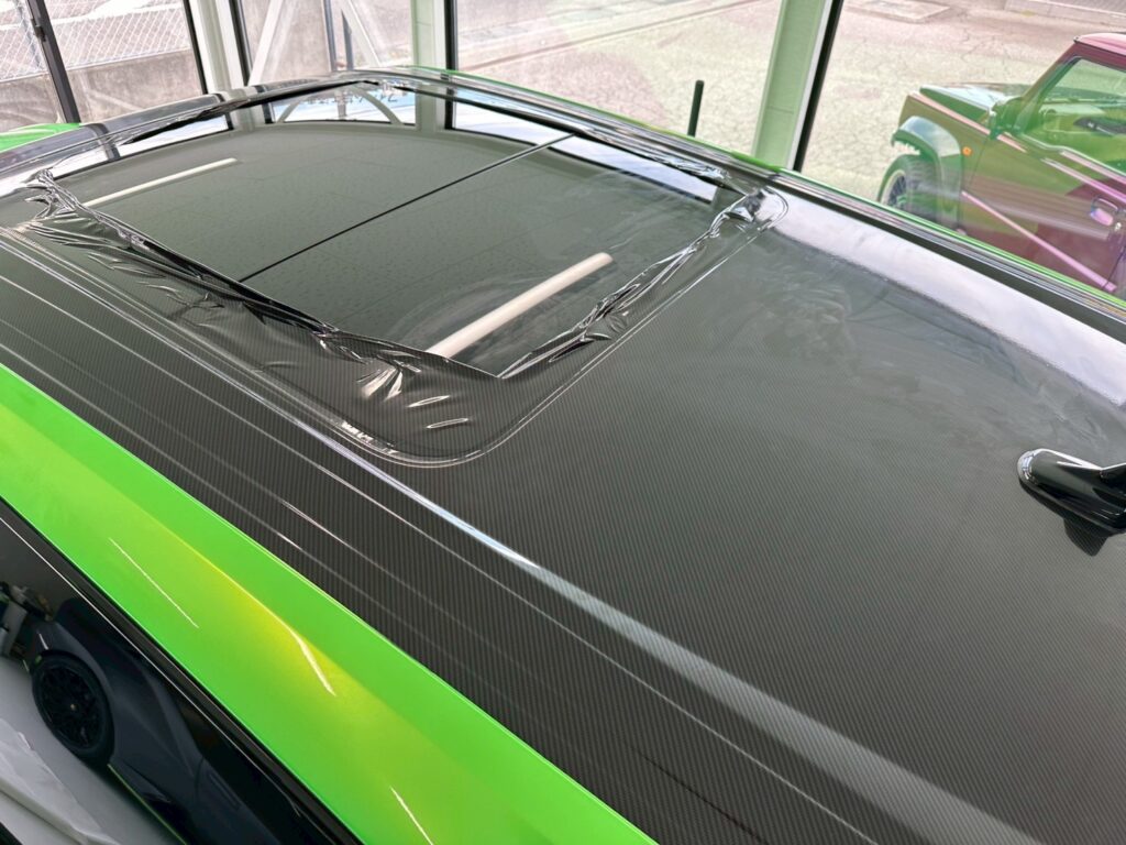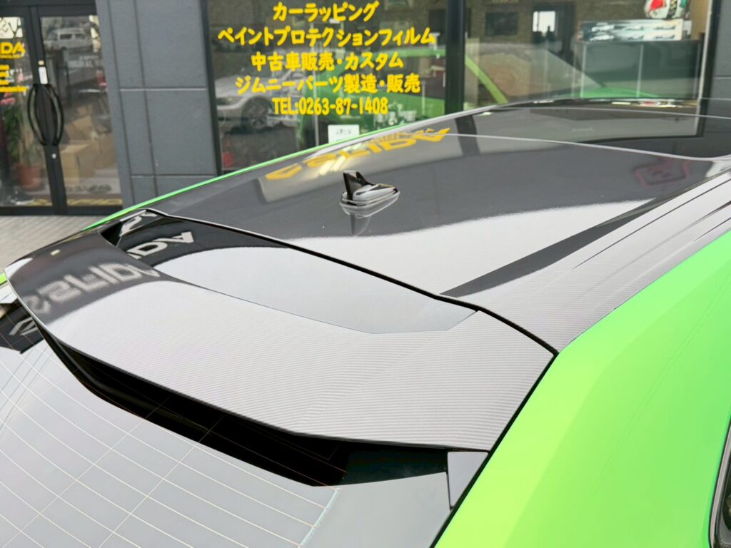 ルーフやスポイラー、ホイールアーチ、サイドステップなどは、カーボン柄を使用してラッピングを行い、スポーティーに仕上げました!